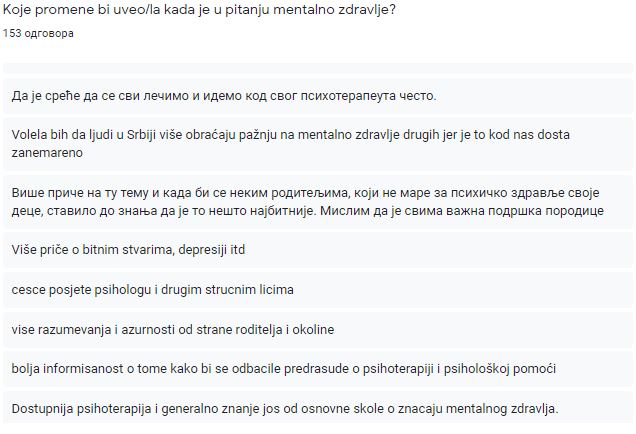 Na pitanje šta to u Srbiji treba da se promeni da bi se i mentalno zdravlje poboljšalo, Marina, kao i ostali ljudi sa kojima smo razgovarali imaju sličnu sliku o tome – edukacija. Generalno edukacija o svemu što danas psihički može da zadesi mlade, savetovalište od osnovne škole, jer se već tamo dešavaju problemi o kojima deca ne govore, jednostavno jer ih je strah od reakcije okoline. Navikli smo na to da takve stvari nisu normalne i da bi svakog videli samo kao osobu koja glumi žrtvu i priželjkuje pažnju.